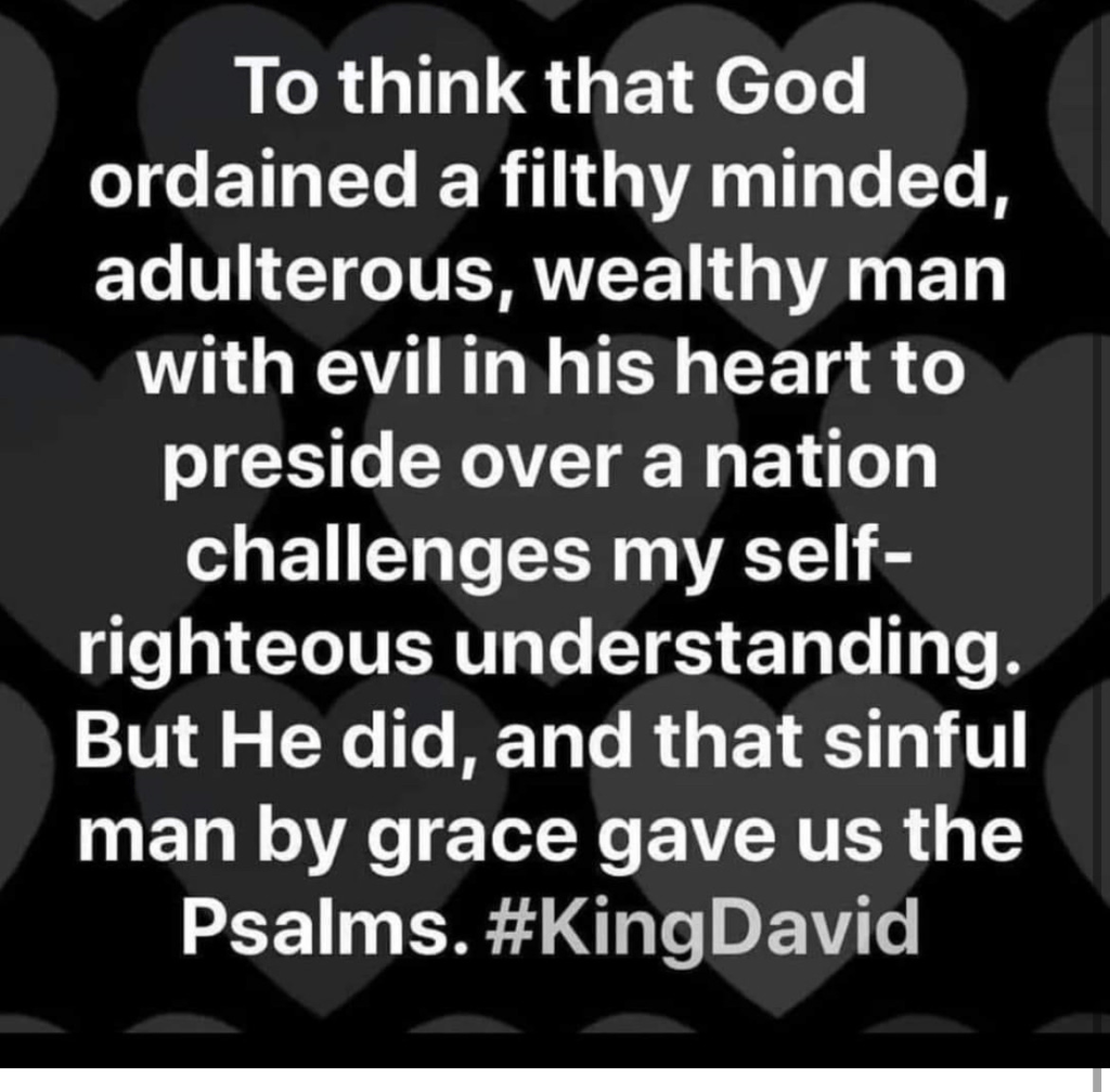 Believers should remember that God didn’t use David because David was wicked. God used him in spite of David’s wickedness. David was a chosen vessel/instrument of God. David didn’t always do the right thing, but the Bible says he was a man after God’s own heart. This meme appears to excuse wickedness for the greater good, but God NEVER condones or excuses sin. Believers need to be careful to not ‘look the other way,’ when leaders they agree with politically misbehave. Sin is sin, no matter who is doing it and God isn’t pleased when leaders commit it.